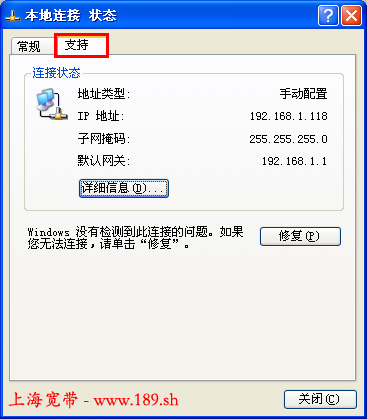 点击“支持”,可看到IP地址等信息,如需要查询更加详细的IP地址及DNS等信息,可点击“详细信息”